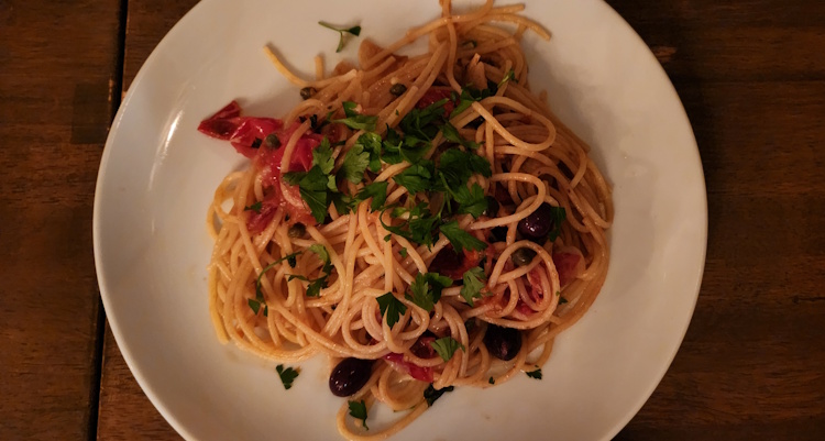 “Puttanesca: Spaghetti, anchovy, black olives, capers, red pepper.”